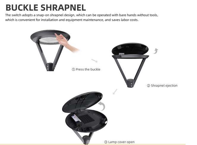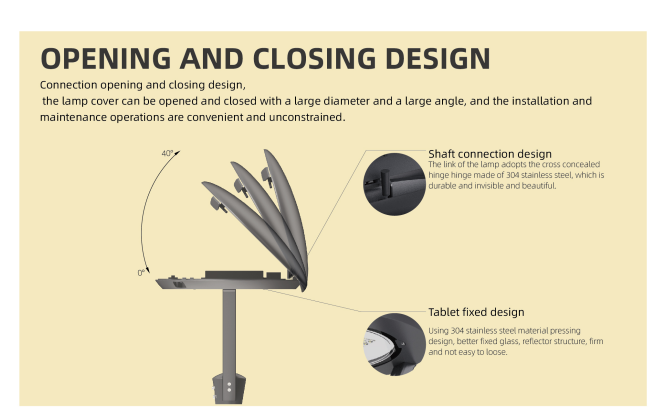 കണക്ഷൻ ഓപ്പണിംഗ്, ക്ലോസിംഗ് ഡിസൈൻ, വിളക്ക് കവർ തുറക്കാനും വലിയ ഒരു വലിയ ആംഗിൾ ഉപയോഗിച്ച് അടയ്ക്കാനും കഴിയും,